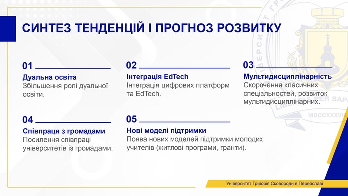 Педагогічна освіта стоїть перед необхідністю швидкої модернізації. Прогноз на найближчі 3-5 років говорить про збільшення ролі дуальної освіти, інтеграцію EdTech і цифрових платформ, скорочення класичних спеціальностей та розвиток мультидисциплінарних, посилення співпраці університетів із громадами, появу нових моделей підтримки молодих учителів (житлові програми, гранти, премії).