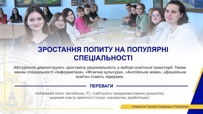 Абітурієнти демонструють зростаючу раціональність у виборі освітньої траєкторії. Спеціальності «Інформатика» (зростання заяв понад 60 %), «Фізична культура і спорт» (+41 %), «Англійська мова та зарубіжна література» (+38 %) та «Дошкільна освіта» стали лідерами через очевидні переваги: глобальний попит (англійська, ІТ), стабільність працевлаштування (дошкілля) та широкий спектр зайнятості (спорт, тренерство, реабілітація).