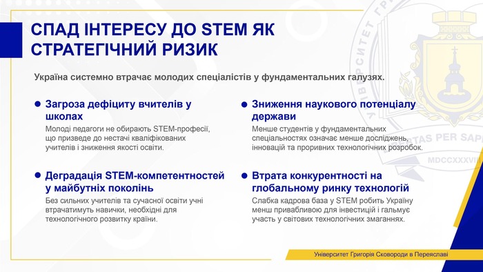 Натомість Україна системно втрачає молодих спеціалістів у фундаментальних галузях. Падіння інтересу до фізики, хімії та математики означає загрозу дефіциту вчителів у школах, зниження наукового потенціалу держави, деградацію STEM-компетентностей у майбутніх поколінь та втрату конкурентності на глобальному ринку технологій.