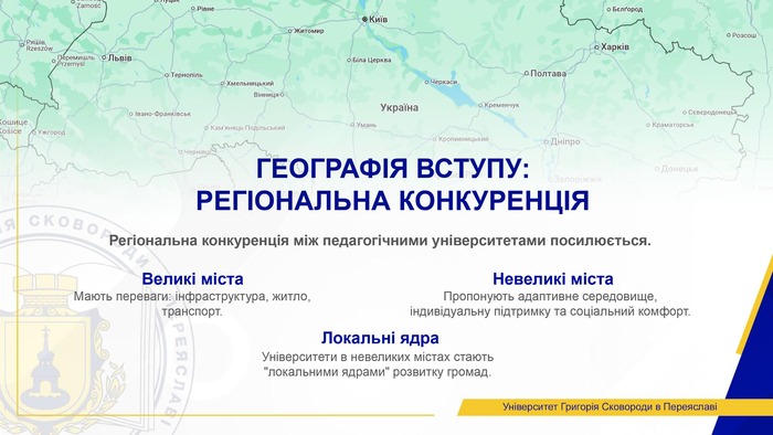 Великі міста мають переваги в інфраструктурі, житлі та транспорті, але університети у невеликих містах – таких як Переяслав, Умань, Дрогобич та Кам’янець-Подільський – пропонують більш адаптивне середовище, індивідуальну підтримку студентів і соціальний комфорт. Такі університети стають «локальними ядрами» розвитку громад та формують основу кадрового забезпечення регіональних шкіл.