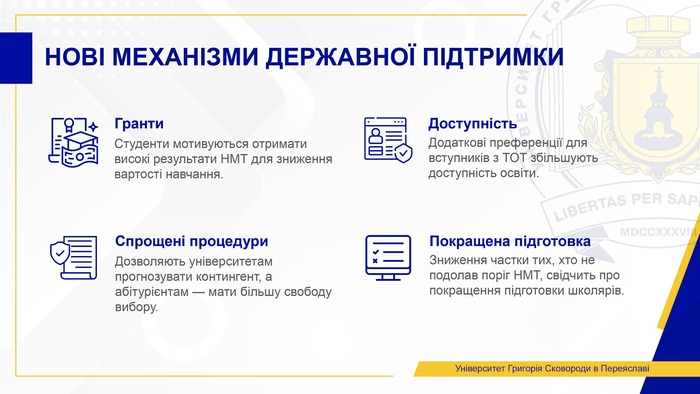Запроваджені у 2025 році державні гранти створюють нову логіку вступу: студенти мотивуються отримати високі результати національного мультипредметного тесту, щоб знизити вартість навчання. Додаткові преференції для вступників з ТОТ збільшують доступність освіти.