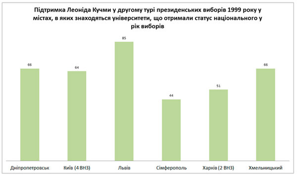 Аби показати детальніше процес роздачі статусів національного у виборчий рік – продемонструємо поділ за містами, де знаходились ощасливлені у 1999 році університети. У другому турі президентських виборів кожне з цих міст, окрім Сімферополя, віддало більшість голосів (інколи значну) саме за Кучму.