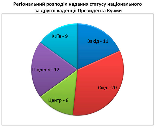 Якщо подивитись на регіональний розподіл статусів загалом, теж розкриються певні вподобання президентів – чи-то електоральні, чи-то якісь інші. З огляду на значну концентрацію ВНЗ у столиці, виокремимо Київ в окрему графу. Тож за першої каденції Кучми більше половини статусів попрямувало до Києва. Це зрештою і не дивно, адже першими, хто почав отримувати їх були саме провідні столичні виші, конкурувати з якими регіональним ВНЗ у 1990-х було ще важче, ніж зараз. Друге місце посідають університети зі Сходу – три статуси попрямували до Харкова та два до Дніпропетровська. За другої каденції Схід України яскраво вийшов уперед – там були роздані 20 статусів національного ВНЗ, далі йшли Південь (12), Захід (11) та Київ (9). У свою чергу Ющенко більше тішив західноукраїнські університети (10), трохи менше ВНЗ з Центральної України (7).