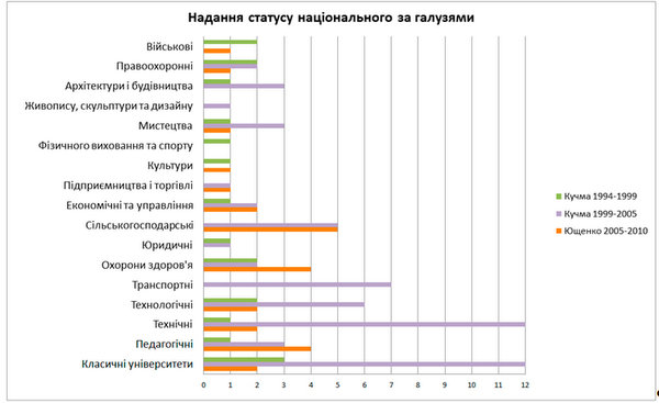 Найбільш рясно надав національних статусів Леонід Кучма - на його дві каденції перепадає 79 вищих навчальних закладів. Віктор Ющенко ощасливив 26 університетів, а Віктор Янукович за свої три роки встиг надати 9 таких статусів. Показовою є активізація конвеєру у рік виборів. Так, 10 із загалом 19 статусів, розданих за першої каденції Кучми, припадає на 1999 рік, коли відбулись вибори Президента. Менш показова ситуація була під час виборів 2004 року, на цей рік перепадає чверть усіх розданих статусів за другу каденцію Кучми. Не відставав від свого попередника і Ющенко – 11 із 15 статусів були роздані у 2009/2010 році.
