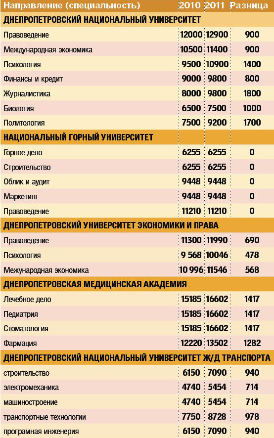 Наприклад, якщо за рік навчання майбутнього політолога в Дніпропетровському національному університеті ім. Олеся Гончара (ДНУ) в 2010-му потрібно було заплатити 7500 грн., то цього року виш просить на 1700 більше.