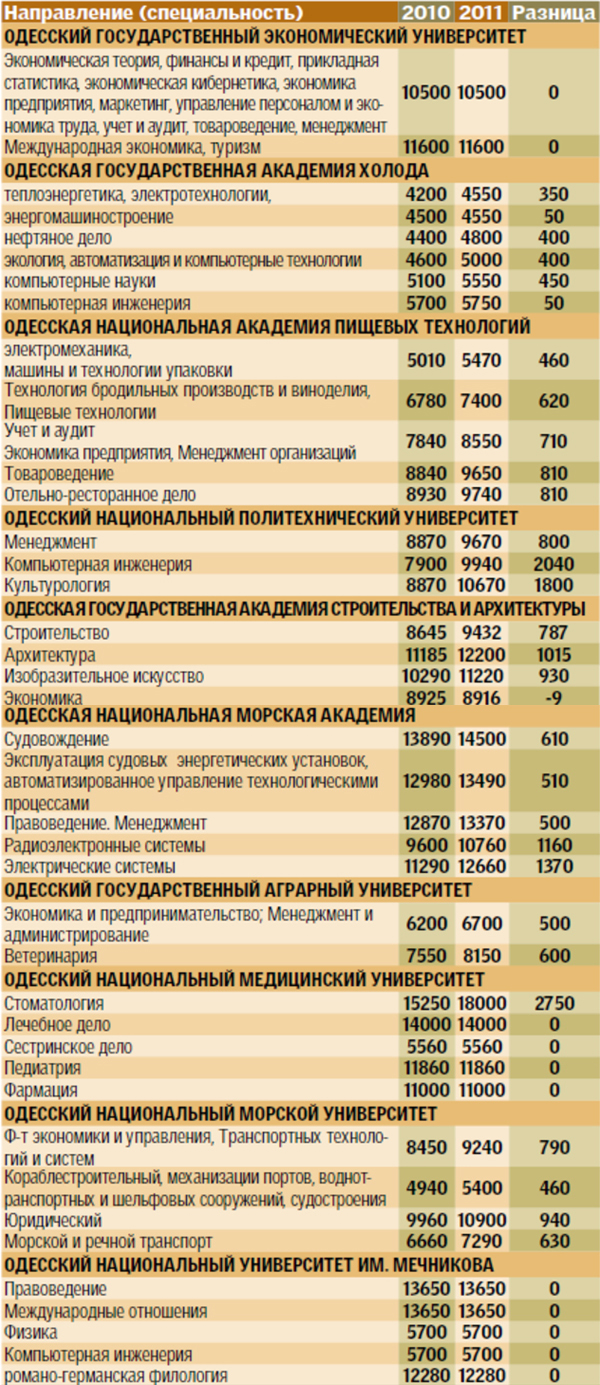 А ось один з найбільших вишів - Одеський національний політехнічний університет, який щороку набирає студентів на 63 спеціальності, від підвищення не відмовився (в середньому, вартість контракту в ОНПУ зросла на 1,5-2 тисячі грн. за рік) і навіть ввів дві нові спеціальності - "теплоенергетика" та "радіотехніка".
