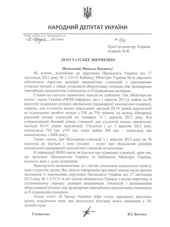 "Враховуючи вищесказане та з метою посилення соціального захисту прав студентів, прошу Вас надати інформацію про вжиті заходи щодо причин зволікання з виконанням доручення Президента України від 17 листопада 2012 року №1-1/3115 та які заходи вживаються Урядом з метою перегляду в установленому порядку розмірів академічних стипендій і встановлення обґрунтованої різниці між ординарною (звичайною) академічною стипендією та її підвищеним розміром", - йдеться у зверненні народного депутата Віктора Балоги до прем’єра.