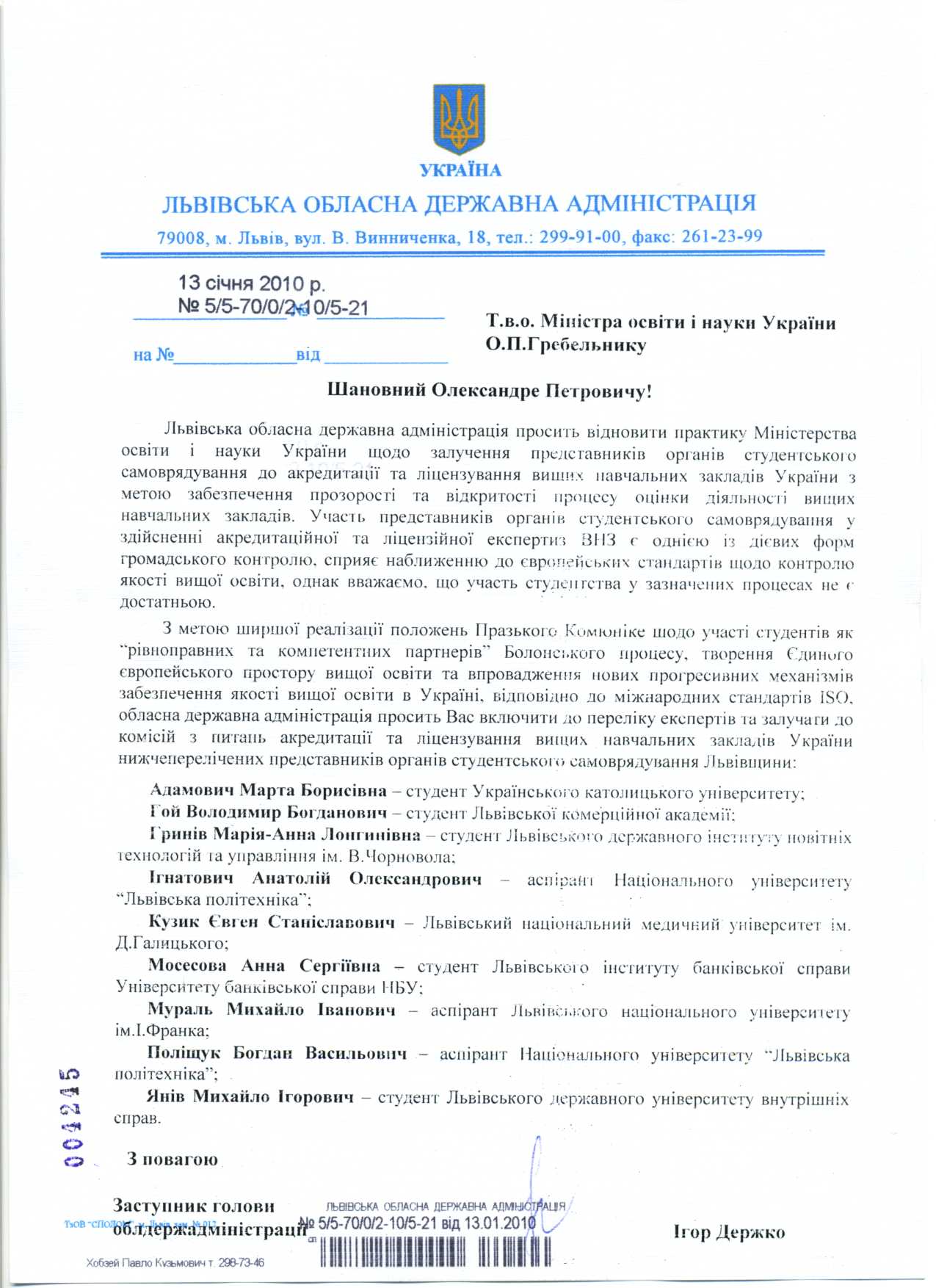 Участь представників органів студентського самоврядування у здійсненні акредитаційної та ліцензійної експертиз ВНЗ є однією із дієвих форм громадського контролю, сприяє наближенню до європейських стандартів щодо контролю якості вищої освіти, однак вважаємо, що участь студентства у зазначених процесах не є достатньою, - ідеться у листі Львівської обласної державної адміністрації до Міністерства освіти і науки України.