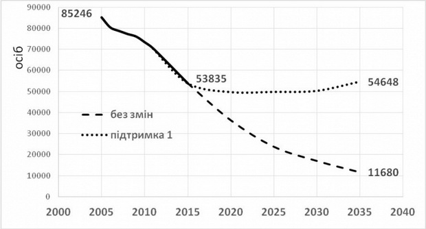 На малюнку вище показано розрахунок варіанту динаміки кількості дослідників («підтримка 1»), який був би реалізований у випадку, коли такі заходи були б достатні для збільшення приросту вікових груп до 29 років на 25% за кожне п’ятиріччя, не допускаючи за такий же період більше 10% втрат вчених віком від 30 до 59 років, а старших 60 років – понад 25%.