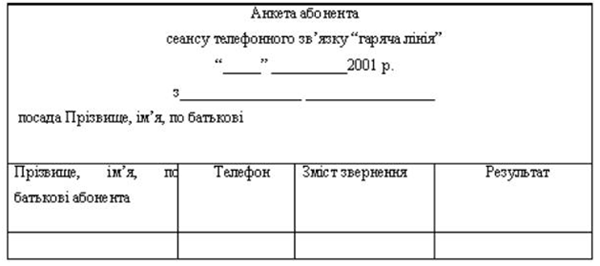 - відповідальний за проведення "гарячої лінії" починає роботу на лінії за півгодини до оголошеного часу, при бажанні абонента може заповнювати анкету із запевненням довести зміст звернення до керівника;