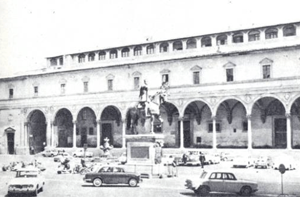 Від Соборної площі Флоренції вузькою вулицею, що тягнеться на північний схід, виходимо на площу Сантіссіма Аннунціата, прямокутну в плані. Прямо напроти — аркада портика церкви Аннунціати, ліворуч ритм аркади продовжує споруда монастиря Сервітів, а на південь витяглася аркада портика Оспедале дельї Інноченті.