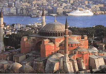 Після завоювання Константинополя в 1453 р. турки піввіку придивлялися до Айе-Софии, як вони називають храм, а потім стали відтворювати її в численних мечетях, у тім чи іншому ступені, що наближаються до настільки ж недосяжного, як і у візантійський час, зразку. Але турецькі архітектори, серед яких був і знаменитий Сінан, завжди намагалися не тільки копіювати план і особливості інтер'єра Софії, але і додати зовнішньому вигляду своїх мечетей нова якість - вони створювали фасади. Чого в храмі-зразку очевидно немає.