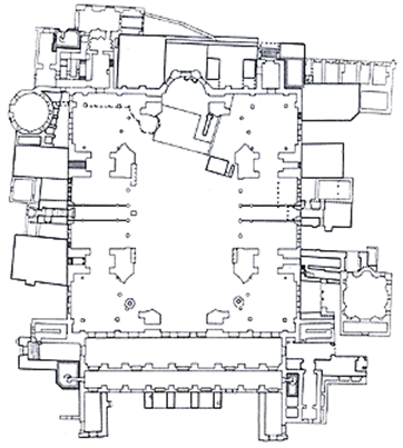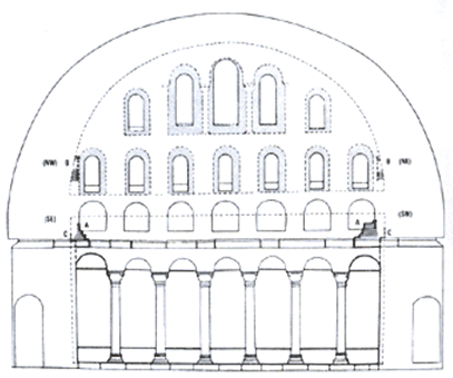 На місці великої базиліки почали зводити величезний центричний будинок з куполом, що накриває величезний кубічний простір. Чотири масивних опори, що підтримують ребристий купол на невисокому барабані, заховані за базилікальній побудові плану. Зі сходу та із заходу купол ускладнюється великими півкругами і напівкуполами екседр, у які уписане по трьох екседри меншої висоти.