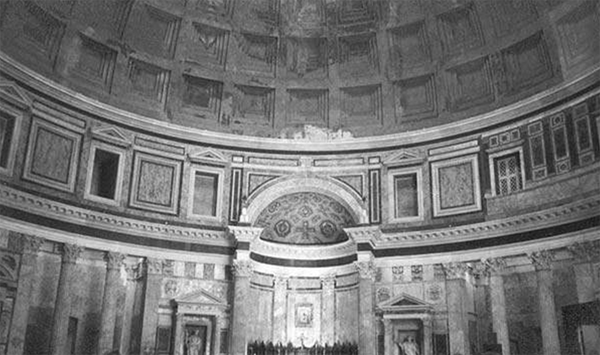 І ще один великий винахід римлян – купол. Хоча ми вже бачили купольні будівлі в егейській і етруській архітектурі, але справжній купол змогли створити тільки римляни. У досконалості опанувавши мистецтвом кладки арок і зведення зводів, римляни створили купол, що виявився логічним завершенням розвитку цих конструкцій. Купол, як безліч арок, перекинутих через одну точку – замок-купола, – у всієї своїй вроді з'являється перед нами у великому римському спорудженні епохи імператора Адріана в Пантеоні, побудованому в 117-138 роках і присвяченому семи головним римським богам.