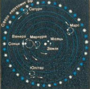 Відома вам і геоцентрична система світу, розроблена в II ст. н. е. давньогрецьким ученим Клавдієм Птоломеєм. Він у центрі світу "поставив" хоч і кулясту, але нерухому Землю, навколо якої оберталися всі інші світила (мал. 1).