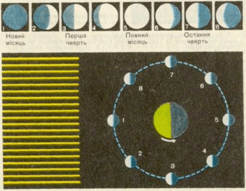 Мал. 1. Зміна місячних фаз (сонячної промені падають зліва, вгорі зображені місячні фази, видимі із Землі)