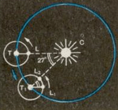 Місяць L через 27,3 доби, зробивши повний оберт, займе попереднє положення відносно зір. Земля Т за цей час разом з Місяцем пройде по своїй орбіті відносно Сонця дугу TТ1, що дорівнює майже 27 °, оскільки щодоби він зміщується приблизно на 1 °. Щоб Місяць і, зайняв попереднє положення відносно Сонця і Землі T1 (настав молодик), потрібно ще дві доби. Справді, Місяць проходить за добу 360 °: 27,3 доби = 13 °/доби, щоб пройти дугу 27 °, йому необхідно 27°: 13/ доби =2 доби. Так і виходить, що синодичний місяць Місяця становить близько 29,5 земної доби.