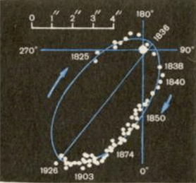 Головна зоря звичайно не знаходиться у фокусі видимого еліпса, який описує супутник, бо ми бачимо його орбіту в проекції викривленою. Але знання геометрії дає змогу встановити справжню форму орбіти й виміряти її велику піввісь а в секундах дуги. Якщо відома відстань О до подвійної зорі в парсеках і велика піввісь орбіти зорі-супутника в секундах дуги дорівнює а", то в астрономічних одиницях вона дорівнюватиме: