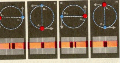 Нехай компоненти займають положення A1, і B1, й А3 і В3, тоді один з них рухається до спостерігача, а другий - від нього (мал. 74, І, III). У цьому разі спостерігається роздоєння спектральних ліній. У зорі, яка наближається, спектральної лінії зміщуються до синього кінця спектра, а в тієї, що віддаляється. - до червоного. Але якщо компоненти подвійної зорі займають положення A2 і В2 чи А4 і В4 (мал. 2, II, IV), то обидва вони рухаються під прямим кутом до променя зору і роздвоєний спектральних ліній не буде.