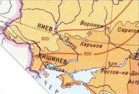 Червоними лініями з цифрами позначені ізолінії сумарної сонячної радіації в МДж/кв. м.