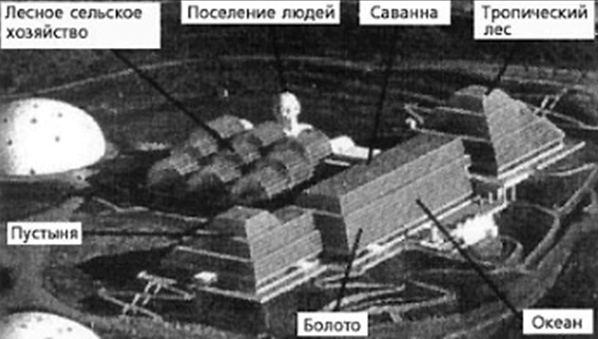 У спорудженні "Біосфери-2" - ініціатором цього широкомасштабного експерименту став колектив Колумбійського університету (штат Нью-Йорк), а виконавцем стала американська фірма "Space Biospheres Ventures" (спочатку проект фінансував техаський мультимільйонер Е. Басс, що виділив 30 мільйонів доларів) - брали участь інженери, архітектори, біологи, гідробіологи, ботаніки, бактеріологи і представники ще дуже багатьох наук і професій. На площі в 9 тисяч квадратних метрів (біля гектара) під скляними ковпаками (а "дно" було ізольовано від землі герметично звареними сталевими аркушами) була зведена зменшена копія Землі.