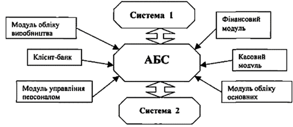 1. Система повинна мати модульну структуру, що дозволяє будувати її конфігурацію з базових модулів та підсистем, і складатися з програмних модулів для проведення операцій із цінними паперами та готівкою, обслуговування фізичних осіб, обліку основних засобів і товарно-матеріальних цінностей, управління персоналом та нарахування заробітної плати, фінансового аналізу, управління активами (пасивами), а також виробничими процесами (рис. 1). Передбачається можливість підключення системи "клієнт-банк".