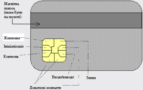 Чіп- та смарт-картки. Описуються стандартом ІSO 7816. Мають автономний спеціалізований контролер доступу (чіп-картки) чи мікропроцесор (смарт-картки) та декілька видів електронної пам’яті. Обмін інформацією із банкоматом (пристроєм ініціалізації) здійснюється або через 8-контактну область (рис. 2), або є безконтактним. Безконтактна картка (суперсмарт-картка) має автономне джерело живлення, LCD-дисплей, клавіатуру та антену. Картки можуть бути комбінованими, коли зворотна (безконтактна) сторона також містить магнітну смугу.