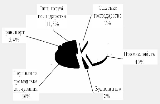Кредити, надані суб'єктам підприємницької діяльності, за галузями економіки розподіляють так; позички, спрямовані в промисловість, — 40,0%, торгівлю та громадське харчування — 35,8%, сільське господарство — 6,6,% транспорт — 3,4%, будівництво — 2,4%, інші галузі народного господарства — 11,8%, як це показано на рис. 2.
