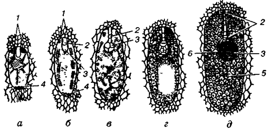 Мал. 2. Послідовні етапи (а—д) розвитку ендосперму і зародка насінини дводольних (схема): 1 — синергіди; 2 — підвісок; 3 — зародок; 4 — антиподи; 5 — ендосперм; 6 — ущільнені клітини ендосперму, що оточують зародок.