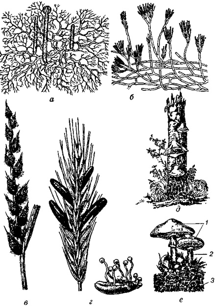 Мал. 1. Гриби: а — мукор; б — пеніцил (а, б — збільшено); в — сажка; г — ріжки (праворуч — пророслий склероцій); д — трутовик; е — шапковий гриб (1 — шапка; 2 — пеньок; 3 — міцелій).