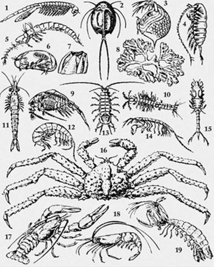 Походження ракоподібних неясно. По одній гіпотезі, вони відбулися від древніх вимерлих членистоногих - трилобітів, по інший, - від кільчастих хробаків, незалежно від трилобітів. У викопному стані Р. відомі починаючи з кембрію.