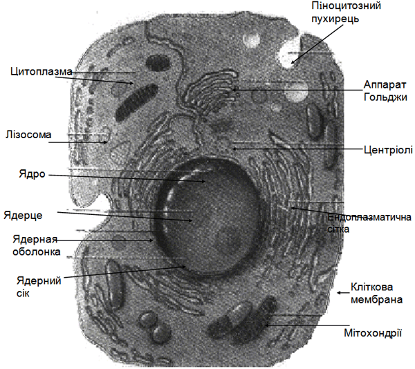 Цитоплазма. Відмежована від зовнішнього середовища плазматичною мембраною, цитоплазма являє собою внутрішнє напіврідке середовище кліток. У цитоплазму еукариотических кліток розташовуються ядро і різні органоїди. Ядро розташовується в центральній частині цитоплазми. У ній зосереджені і різноманітні включення - продукти клітинної діяльності, вакуолі, а також дрібні трубочки і нитки, що утворять кістяк клітки. У складі основної речовини цитоплазми переважають білки. У цитоплазмі протікають основні процеси обміну речовин, вона поєднує в одне ціле ядро і всі органоіди, забезпечує їхню взаємодію, діяльність клітки як єдиної цілісної живої системи.