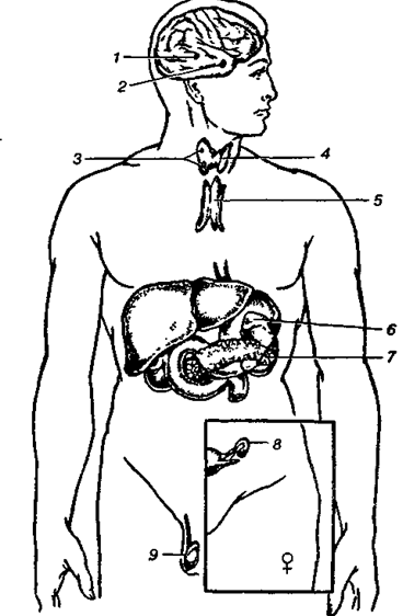 Мал. 1. Залози внутрішньої секреції людини: 1 — епіфіз (шишкоподібна залоза); 2 — гіпофіз; 3 — прищитоподібні залози; 4 — щитоподібна залоза; 5 — загруднинна залоза; в — надниркові залози; 7 — підшлункова залоза; 8 — яєчник; 9 — яєчко (7, 8, 9 — змішані залози)