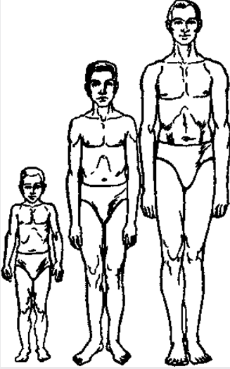 Мал. 2. Чотирнадцятирічні хлопчики: посередині — нормальний, ліворуч —гіпофізарний карлик, праворуч — хворий на гігантизм
