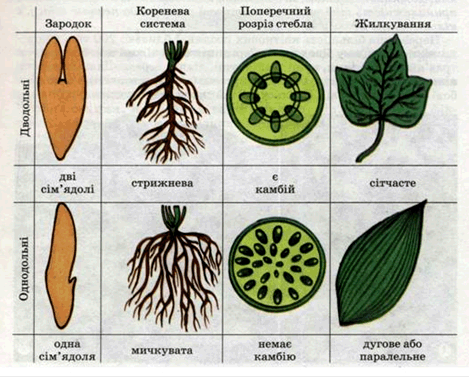 Мал. 1 - Порівняльна будова дводольних і однодольних рослин