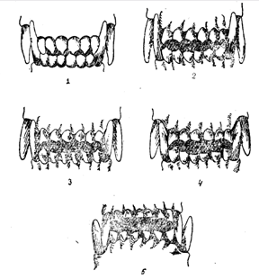 У 4 роки стерті зачепи й починають стиратися середні різці верхньої щелепи. До 5 років стерті окрайки нижньої щелепи й починають стиратися клики. У 6 років стерті окрайки верхньої щелепи, клики тупі. У 7 років зачепи нижньої щелепи приймають зворотньо-овальну форму. До 8 років середні різці щелепи приймають зворотньо-овальну форму. У 9 років зачепи верхньої щелепи приймають зворотньо-овальну форму. З 10-12 років починають випадати зуби: спочатку зачепи нижньої щелепи, потім верхньої.
