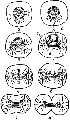 а—в — профаза; г—д — метафаза; е — анафаза; е—ж — телофаза; 1 — ядро; 2 — ядерце; 3 — центріола; 4 — хромосоми; 5 — діастер; 6 — центральне веретено.
