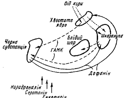 Нейротрансмітери базальних гангліїв. Велика увага приділяється дослідженню механізмів передавання імпульсів у гангліях за участю різних медіаторів. Нейрони, що зв'язують чорну речовину з хвостатим ядром і шкаралупою, виділяють дофамін. Інформація від хвостатого ядра і шкаралупи передається до блідої кулі і чорної речовини за допомогою ГАМК. Через ацетилхолін реалізуються впливи від кори великого мозку до хвостатого ядра і шкаралупи (мал. 3). Нейрони стовбура головного мозку виділяють різні нейротрансмітери — норадреналін, серотонін, енкефалін та ін.