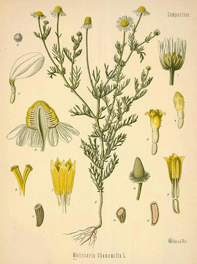 Фармакологічні властивості. Ромашка лікарська на початку дії збуджує центральну нервову систему, підсилює рефлекторну діяльність спинного мозку, прискорює дихання, ритм серця, розширює судини мозку. Потім ці ефекти змінюються пригніченням центральної нервової системи, зниженням рефлекторної діяльності спинного мозку, тонусу м'язів. Ромашка виявляє дезінфікуючу, протизапальну, "вітрогінну", в'яжучу, пом'якшувальну протиспазматичну дію, а також збільшує секрецію залоз каналу і жовчовиділення.