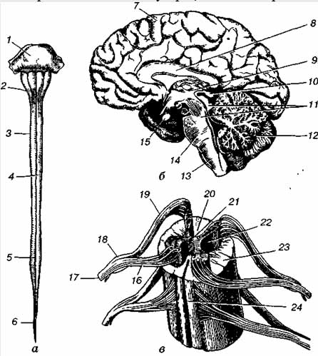 а — спинний мозок (загальний вигляд); б — головний мозок (поздовжній розріз); в — частина спинного мозку (у верхній частині біла речовина видалена); / — нижній кінець головного мозку; 2 — межа між головним (довгастим) і спинним мозком; 3 — шийне і 5 — поперекове потовщення спинного мозку; 4 — задня серединна борозна; 6 — кінцева нитка; 7 — права півкуля; 8 — перемичка між півкулями; 9 — проміжний мозок; 10 — епіфіз; 11 — середній мозок; 12 — мозочок; 13 — довгастий мозок; 14 — міст; 15 — гіпофіз; 16 — передній корінець спинномозкового нерва; 17 — спинномозковий нерв; 18 — спинномозковий вузол; 19 — задній корінець спинномозкового нерва; 20, 23 — біла речовина; 21 — спинномозковий канал; 22 — сіра речовина; 24 — передня серединна щілина