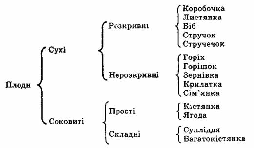 І — сухі; ІІ — соковиті; ІІІ — складні; 1 — ліщина; 2 — соняшник; З— пшениця; 4 — вишня; 5 — абрикос; 6 — малина; 7 — мак; S — капуста; 9 — горох; 10 — смородина; 11 — томат; 12 — шипшина; а — горіх; 6 — сім'янка; в — зернівка; г — кістянка; д — складна кістянка; е — коробочка; є — стручок; ж — біб; з — ягода; й — складний плід з горішками оплодня такого плоду складається з кам'янистих клітин, що утворюють "кісточку" з насіниною.