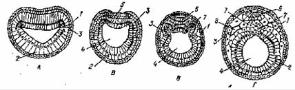 Рис. Гаструляція й утворення комплексу осьових органів у ланцетника (поперечний розріз). А, Б, В— стадії гаструли; Г — формування зачатків осьових органів — нервової трубки, хорди, кишкової трубки: 1 — ектодерма, 2 - ентодерма, 3 — зачаток мезодерми, 4 - порожнина кишки, 5 — нервова пластинка, б — нервова трубка, 7 — хорда, 8 — порожнина тіла.