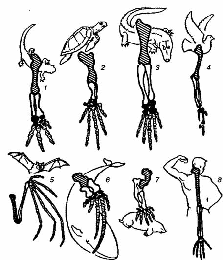 Мал. 1. Скелети передніх кінцівок різних хребетних: