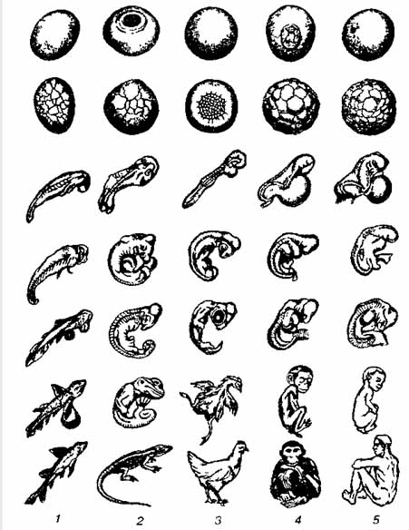 Ембріологічні докази еволюції. Ще до виходу в світ основної праці Ч. Дарвіна академік Російської Академії наук К. М. Бер встановив, що ембріони різних тварин більше подібні між собою, ніж дорослі форми. В цій закономірності Ч. Дарвін вбачав важливий доказ еволюції. Він вважав, що в зародковому розвитку мають повторюватися ознаки предків. У після-дарвінівський період зв'язок онтогенезу з філогенезом було підтверджено численними дослідженнями.