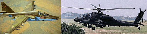 У 80-х роках ХХ століття до пріоритетних цілей ПЗРК додалися штурмовики та ударні бойові гелікоптери: ліворуч - радянський штурмовик ОКБ Сухого Су-25; праворуч - американський бойовий гелікоптер АН-64 "Apache".