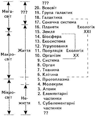 Природні об'єкти (у широкому розумінні — матерія) за розмірами й рівнем складності організації умовно поділяються на 20 рівнів, вказаних на рис. 2.
