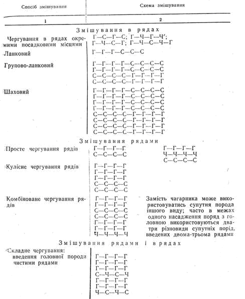 У табл. наводяться основні способи та схеми змішування порід, які використовуються при створенні лісових культур в досліджуваному регіоні.