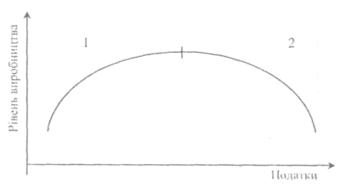 В економічній науці добре відомі співвідношення між ставками оподаткування та величиною надходжень податків у бюджет – крива Лаффера (рис. 1). За підвищення ставок оподаткування сума податкових надходжень у бюджет зростає тільки до певної величини, а потім знижується за рахунок, спаду виробництва й ухиляння від сплати податків. Значний рівень спаду виробництва відповідає відтинку 2 кривої, а отже, зниження ставок оподаткування збільшить не тільки ділову активність, а й суму податкових надходжень у бюджет.