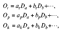 де Ot, Op, Ok — розмір пропозиції відповідно земельних послуг, трудових послуг і грошового капіталу; Da, Db — обсяг сукупного попиту на продукт відповідно а і b, що у станірівноваги дорівнюють обсягам їх пропозиції; at, ap, ak; bt, b, bk —кількість виробничих послуг, що витрачаються на виробництво одиниці продукту відповідно а і b.
