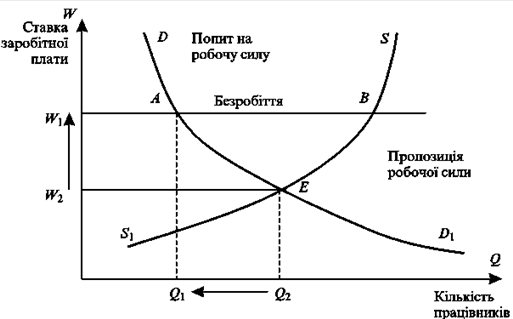- політика уряду і профспілок у сфері оплати праці та підвищення мінімального розміру заробітної плати, що призводить до збільшення витрат виробництва і зниження попиту на робочу силу;